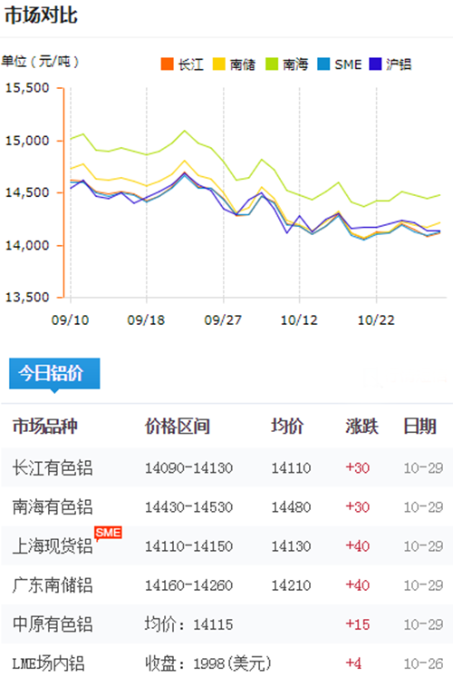 鋁錠價格今日鋁價2018-10-29