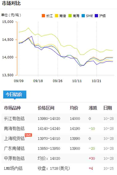 鋁錠價格今日鋁價2019-10-28