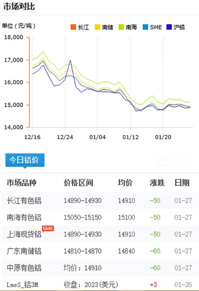 鋁錠價格今日鋁價2021-01-27