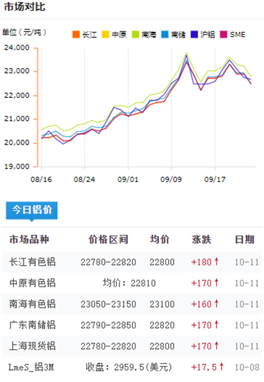 鋁錠價格今日鋁價2021-10-11