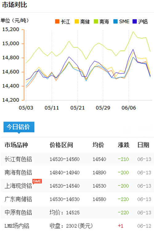 鋁錠價格今日鋁價2018-6-13